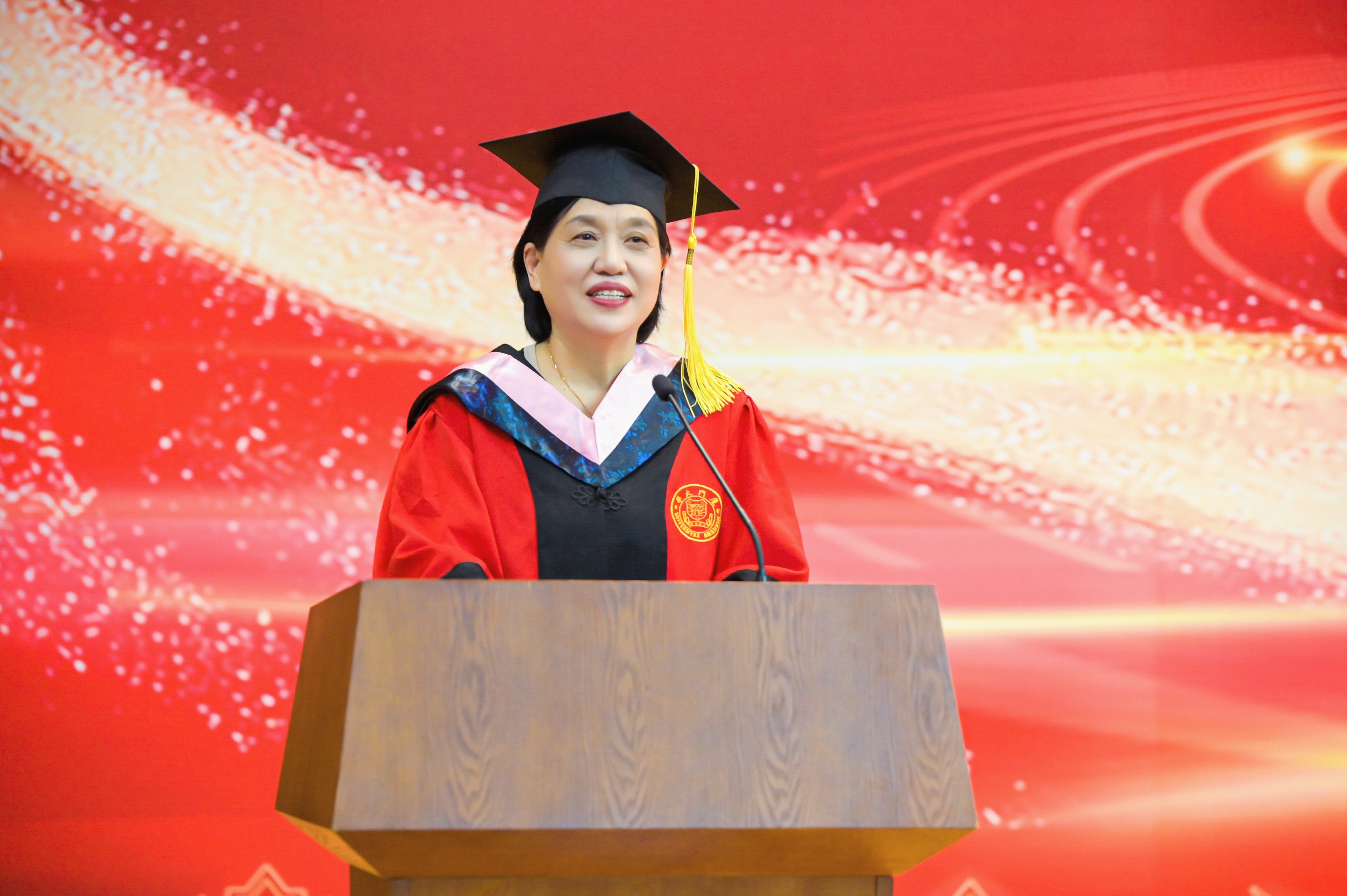 院友代表王桂英发言。她结合自己二十几年的律师执业经历,从四个关键词出发,分享了自身的体会:一是“良知”,坚持以良知和社会责任感守护法律人信仰;二是“谦卑”,坚持谦逊独立的法律人思维;三是“精进”,坚持广大而精微的法律人素养;四是“学习”,坚持学无止境、且行且思的法律人习惯。她殷切寄语毕业生,希望同学们在踏入社会后能处优而不养尊,受挫而不短志,使顺境逆境都成为人生的财富。