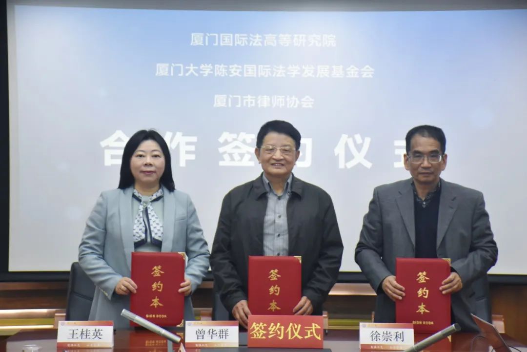 3月12日上午,厦门国际法高等研究院(以下称“研究院”)、厦门大学陈安国际法学发展基金会与厦门市律师协会合作签约仪式在法学院B220会议室举行。厦门市司法局党组成员、副局长李明哲,法学院党委书记何丽新出席并致辞。厦门市司法局律师工作处处长胡雨阳、厦门市律师协会会长王桂英、副会长陈昱、海商海事专业委员会主任王大荣、海丝法务工作委员会副主任郭真、法学院副院长朱晓勤,厦门国际法高等研究院联席院长曾华群、行政理事会秘书长陈辉萍,厦门大学陈安国际法学发展基金会理事长徐崇利、秘书长肖彬参加会议。会议由陈辉萍教授主持。