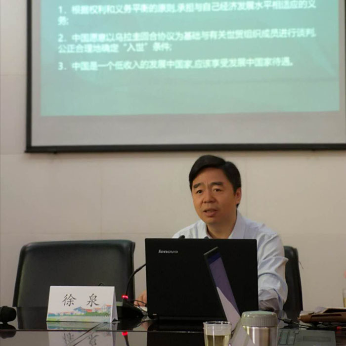 徐泉教授以“发展中成员待遇新发展及中国的因应”为题做了报告。徐泉教授回顾了多边贸易体制中发展中国家待遇的演进,分析了中国作为WTO成员方获得的发展中成员待遇规定。尤其是,徐泉教授详细分析了美、欧盟以及日本借WTO改革企图重大地减损WTO体制中发展中国家成员的待遇,以及作为发展中国成员的巴西表示愿意放弃特殊与差别待遇的背景、主张以及可能产生的影响。为了维护发展中国成员方的正当权益 ,徐泉教授认为应当区别发展中国家待遇和特殊与差别待遇问题;应当对多边贸易体制中互惠理念做广义解读,并引入非互惠作为发展中国家待遇的基础性概念。他认为,面对WTO体制中发展中国家待遇可能发生的重大变革,中国应当主动作为,做好规则应对与策略选择。