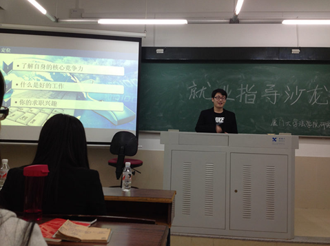 2011级的法律硕士林琳学姐在众多的offer中选择了毕马威企业咨询(中国)有限公司。她首先发言,向在场同学介绍了毕马威招聘的流程,并强调在求职之前应当做好充分准备、熟悉就业信息渠道,对于求职这一场“持久战”要调整好心态并提防虚假招聘。接着,进入厦门农行的王晨安学姐根据自身经历分别介绍了在应聘银行、学校和公务员过程中遇到的问题和应对技巧,并通过展示自己的职业观对各类职业作出分析评价,提醒同学们在职业选择上要考虑的众多因素。学姐幽默的语言、出众的台风赢得了在场同学的热烈掌声。民商法专业的张海涛学长已为北方国际信托股份有限公司所录用,他与在场同学分享了其丰富的求职经历,小到服装领带、自我介绍大到网申求职、面试中的无领导小组讨论,事无巨细地将经验传授给学弟学妹们。此外,张海涛学长还指出“面霸”都是练出来的,在求职过程中总有辛酸,要有强大的内心,永不气馁。最后一位发言的是进入中融国际信托公司的叶绿力学姐,拥有地产行业和金融行业的面试经验的她针对简历的制作、自我介绍以及面试常见问题进行一一介绍,以生动的例子提示同学们如何应对HR的刁钻问题等。之后的互动环节中,场下同学积极询问有关住房公积金、求职性别歧视等问题,各位嘉宾都进行了热情而耐心的解答。