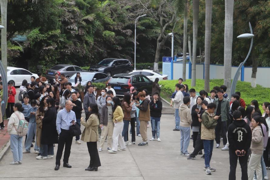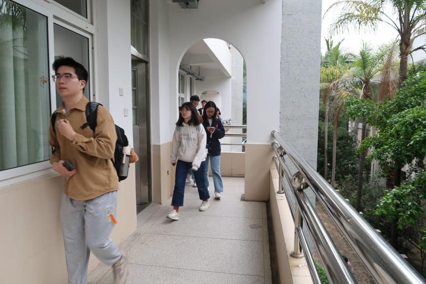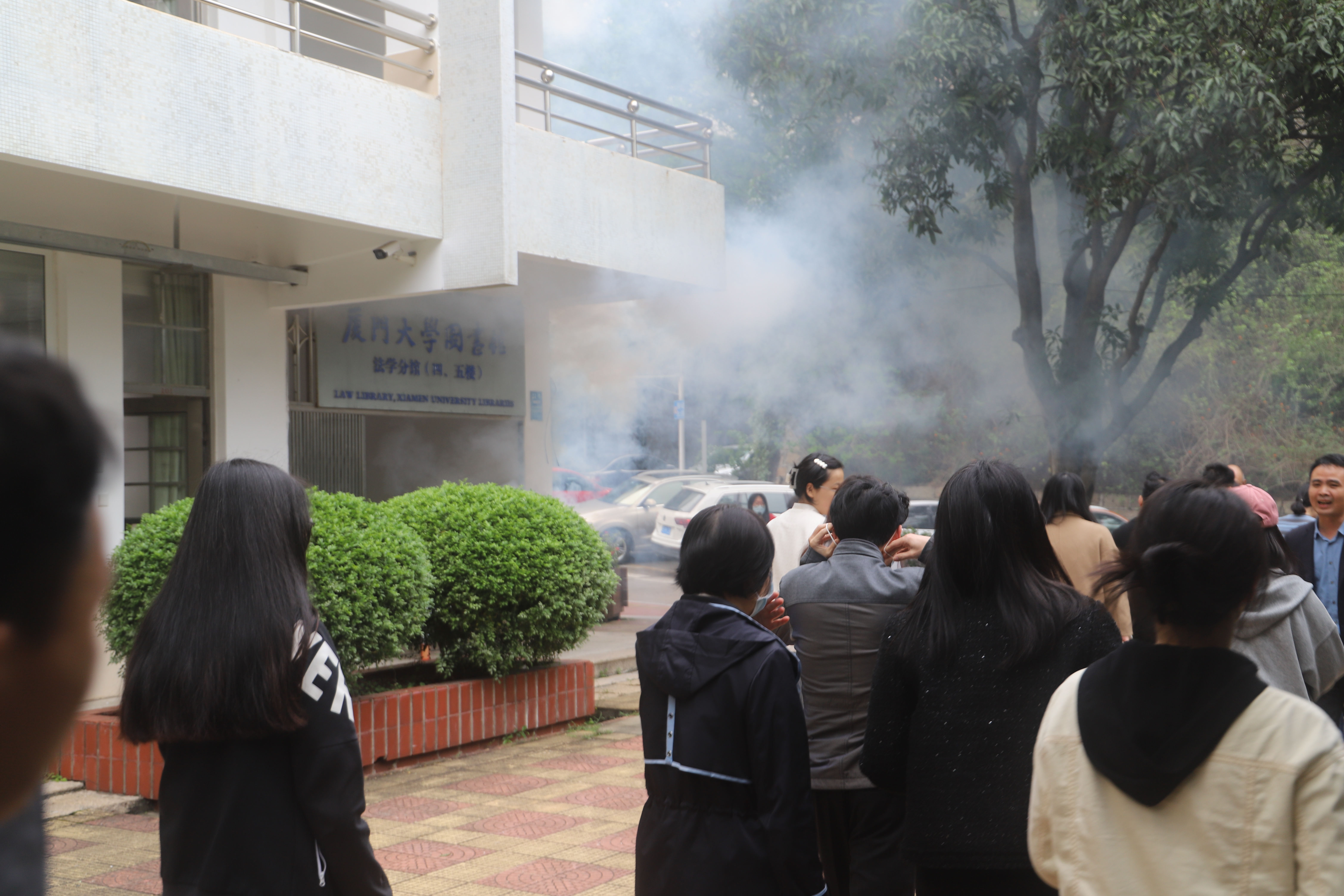 随着工作人员在A栋教学楼释放数枚烟雾弹,模拟真实火灾场景,疏散逃生演练正式开始。白烟迅速弥漫到走廊和教室,安全员见状立即上报火情并启动应急疏散预案。在响亮的疏散口令和口哨声的指引下,全体师生员工迅速沿着消防通道有序撤离至法学院正门前广场的安全区域。整个演练过程井然有序,所有参与者以严肃、认真的态度,顺利完成了既定的演练任务。