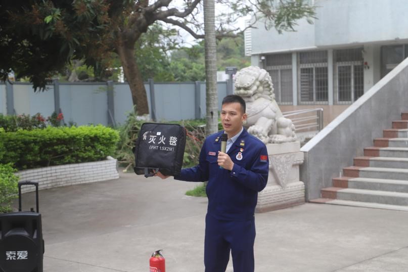 演练结束后,特邀嘉宾思明区厦港消防站的沈建泉教官进行了详细的点评,并讲解火灾疏散逃生技巧。他认为本次演练达到了预期效果,参与者能够按照消防标志快速撤离,没有发生拥挤现象。随后,沈建泉教官现场演示了干粉灭火器和灭火毯等消防设备的使用场景和方法,提升安全应急处置能力。