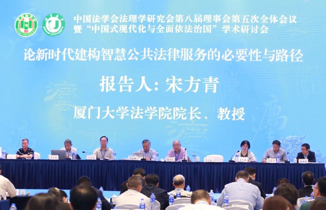 开幕式结束后进入会议主题发言环节,主题发言由上海交通大学凯原法学院沈国明教授、浙江大学光华法学院葛洪义教授主持。南京师范大学法学院公丕祥教授、西南政法大学付子堂教授、华东政法大学胡玉鸿教授、厦门大学法学院院长宋方青教授、华东政法大学马长山教授、清华大学法学院高其才教授、吉林大学法学院李拥军教授及中南财经政法大学法学院陈柏峰教授作主题发言。宋方青教授在主题发言环节中作了题为《论新时代建构智慧公共法律服务的必要性与路径》的报告。宋方青教授强调进入新时代建构智慧公共法律服务,是实现中国式现代化的时代要求,是推进中国法治建设的必然要求,也是坚持以人民为中心的现实要求,我们必须聚焦实践,面对问题,回应人民群众的所需所盼,通过规范建设、平台建设以及队伍建设,全方位、深层次地解决智慧公共法律存在的问题和不足,进而提升智慧公共法律服务的质量和水平,让人民群众的获得感、幸福感、安全感落到实处。