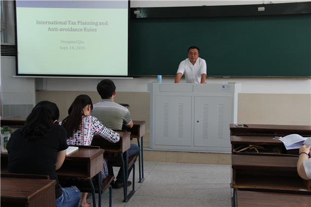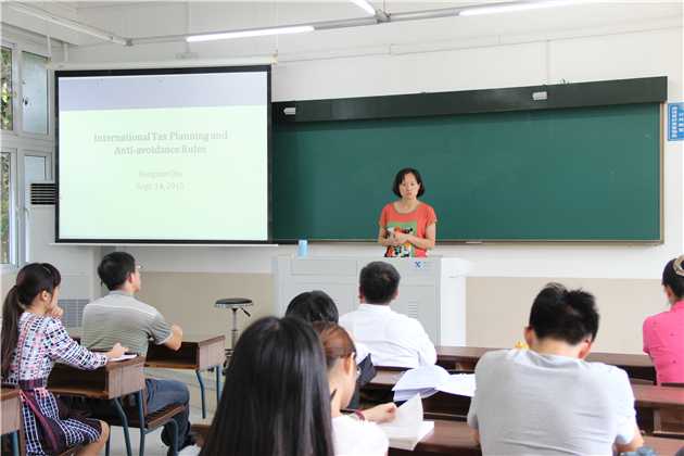 荣荐仪式后,邱冬梅老师上讲台围绕“跨境税收筹划和反避税案例研究”课程进行全英文授课,并且积极与同学们进行教学互动。