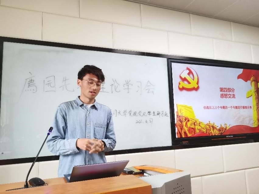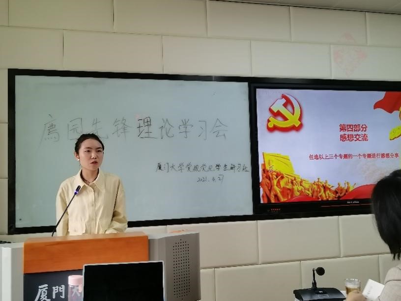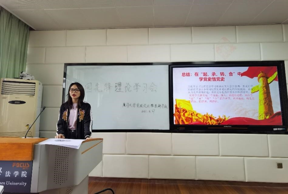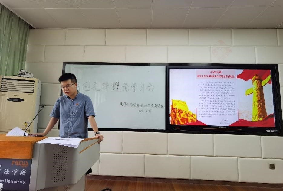 立身百行,以学为基。为更好地开展党史学习教育,实现党史的充分学习和交流分享,夯实基层党建根基,4月27日下午,厦门大学党规党纪学生研习社于法学院B521多媒体教室举行4月廌园先锋理论学习会。研习社骨干成员,指导老师、法学院团委副书记、研究生辅导员周晓牧参加学习会。