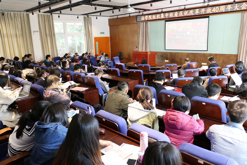 12月18日上午,法学院在B138报告厅组织集中收看庆祝改革开放40周年大会活动。法学院全体党员,民主党派、无党派师生代表等,共计100余人参加收看活动。