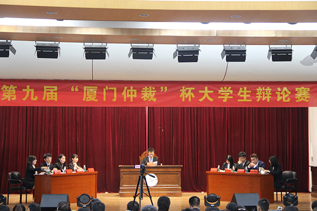 第九届“厦门仲裁”杯大学生辩论赛决赛于12月5日下午三点在厦门大学法学院模拟法庭拉开了帷幕。厦门市仲裁委员会秘书长林建文,厦门市仲裁委员会处长黄伟民,厦门大学法学院党委副书记郭锦星、团委书记高斌、研究生辅导员宋磊华,厦门大学校研究生会主席赵斌,以及全校诸多师生到场观战。本次比赛还邀请到厦门大学法学院周赟教授,厦门大学法学院王云清老师,集美大学李静雅老师,厦门大学法学院民商法博士柯宇航,厦门大学法学院民商法博士陈霖,厦门大学校辩论队成员、第一届启德留学杯国际大学生辩论赛冠军、第三届厦门大学校辩论赛最佳辩手刘澍人,厦门大学校辩论队成员、2013年“阳光杯”中国高校模拟法庭辩论赛冠军、第三届厦门大学校辩论赛冠军马欣然担任评委。