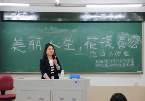 2014年4月9日晚7点,法学院学生会生活部“美丽人生,花漾春容”生活小沙龙准时开场。本次沙龙到场的嘉宾有法学院2010级学生刘佳伟、刘韩汐,鼓浪屿抽屉旅行婚纱写真摄影工作室杨迪迪老师及其助理。本场沙龙分为两大部分,上半场由刘佳伟、刘韩汐分别介绍男女职场装束和面试小技巧,下半场则由杨老师现场化妆教学。