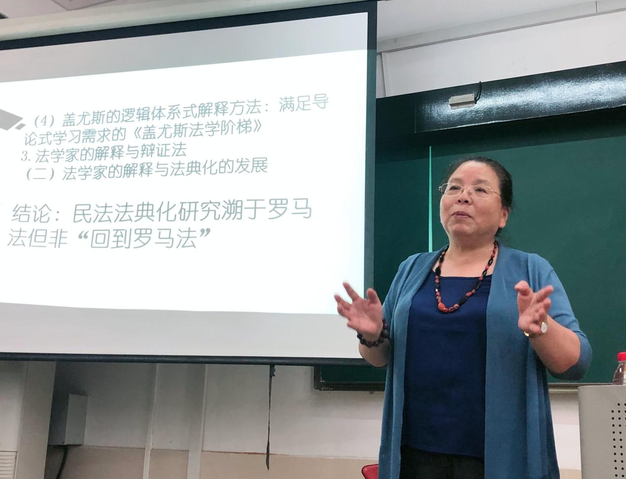 在徐国栋教授进行开篇点题之后,费安玲教授对本次讲座的主旨和内容进行了大致介绍。讲座总共分为六个部分,分别为:近现代民法法典化的三次浪潮、法典的特质、法典编纂之理念、法典化从设想到实践、优士丁尼法典化理论特征,以及法学家的解释与法典化的发展。