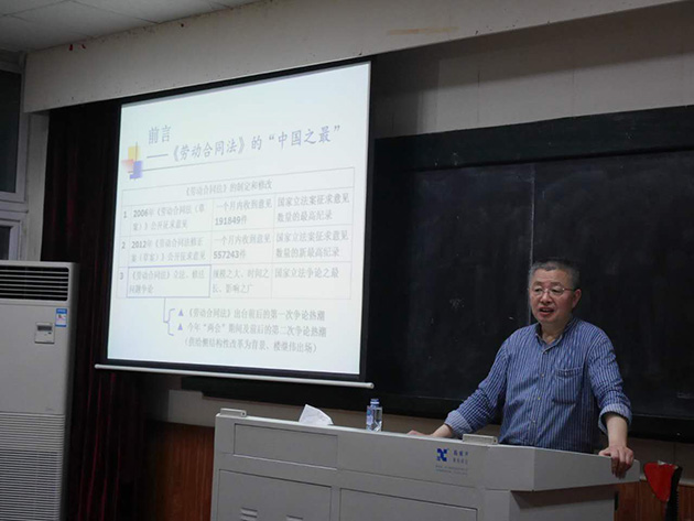 2016年5月23日晚上,上海财经大学法学院教授、博士生导师、中国经济法学研究会副会长、中国社会法学研究会副会长、中国劳动法学研究会副会长、中国人力资源研究会副会长王全兴教授在我院作了题为“供给侧结构性改革中的劳动合同法修改问题之思考”的专题讲座。讲座由蒋月教授主持,吸引了各专业年级的博士、硕士研究生参加。