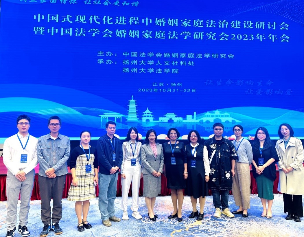 2023年10月21-22日,中国式现代化进程中婚姻家庭法治建设研讨会暨中国法学会婚姻家庭法学研究会2023年年会在江苏扬州召开。此会议由中国法学会婚姻家庭法学研究会主办,扬州大学人文社科处和法学院承办。蒋月教授、何丽新教授、阎语助理教授,以及民商法学专业4位博士研究生同抵扬州参会交流。
