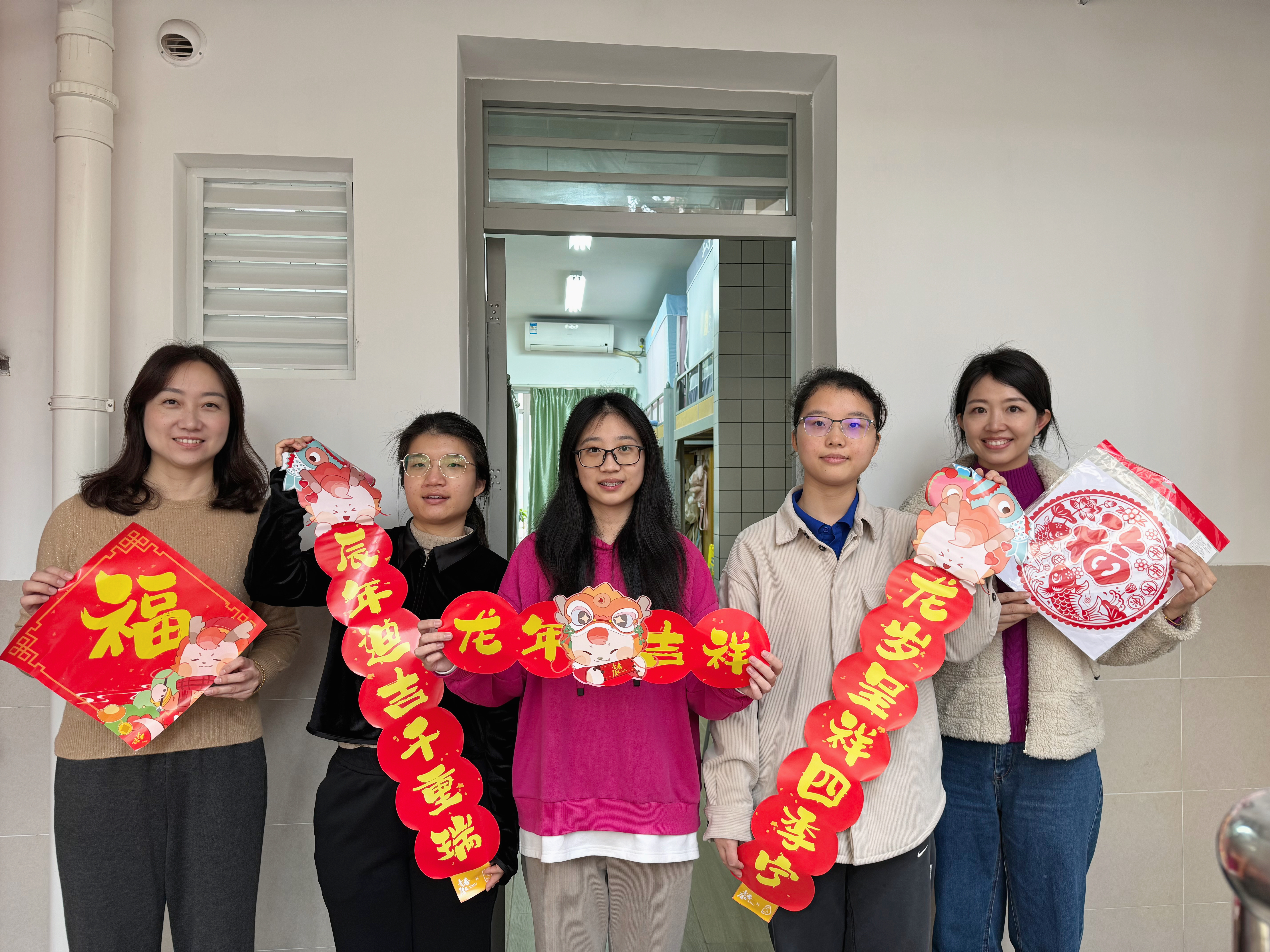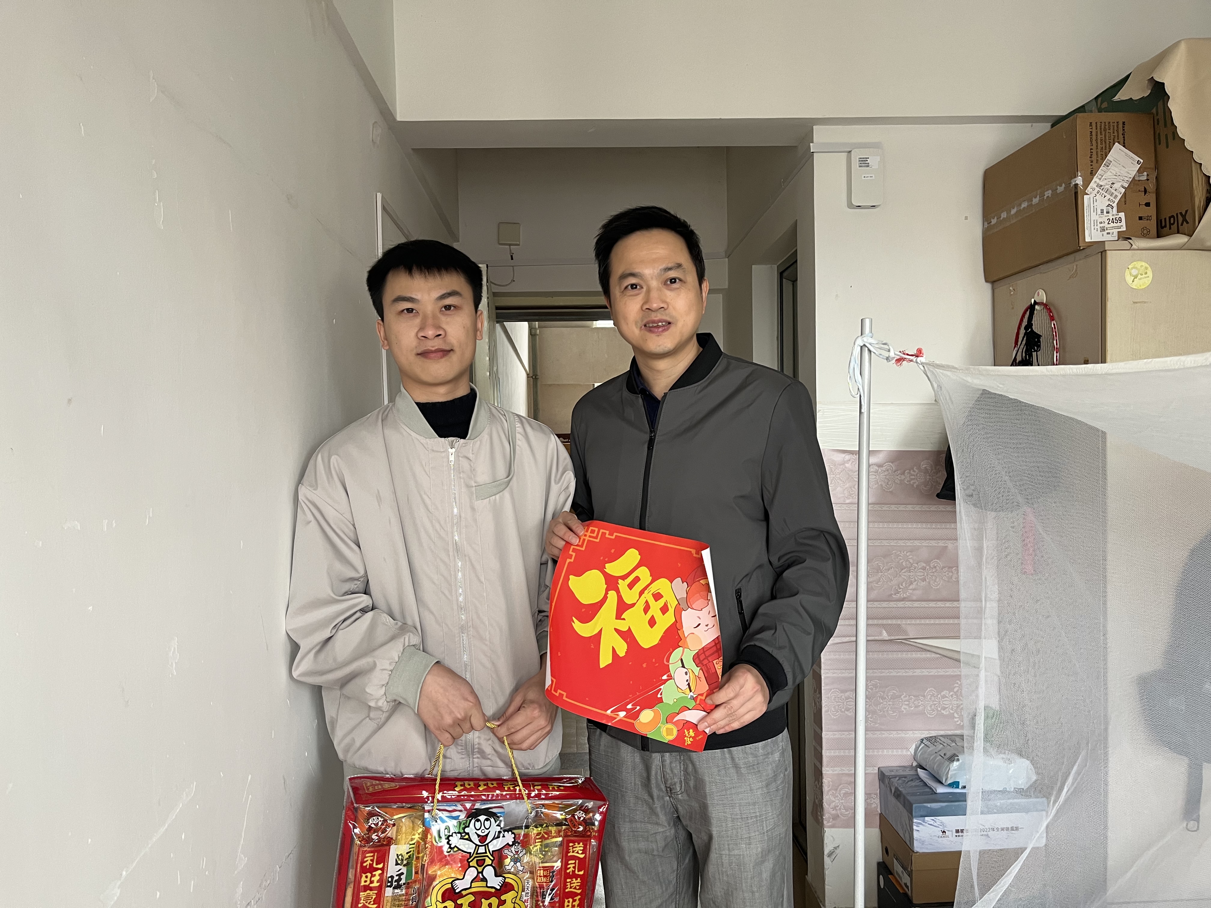 走访中,老师们向同学们送去春联、福字贴纸等年货,并与同学进行亲切交流。老师们询问了同学们的生活情况和假期计划,详细了解了宿舍改造后学生的居住情况,嘱托同学们利用好寒假时间,善于规划、劳逸结合,并叮嘱同学们在宿舍时注意用火用电安全。老师们的亲切慰问让同学们感受到如家人般的温暖。