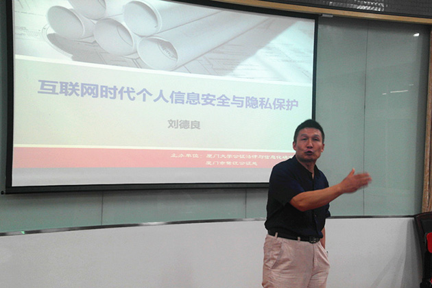 2016年4月25日晚7点,由厦门大学法学院公证法律与信息化研究中心、厦门市鹭江公证处联合主办的厦门大学“鹭江公证论坛”系列讲座之“互联网时代个人信息安全和隐私保护”在厦大法学院B137教室如期举行。此次讲座有幸邀请到了北京师范大学法学院教授刘德良老师作为主讲嘉宾。厦门市鹭江公证处汤庆发副主任主持了此次讲座。