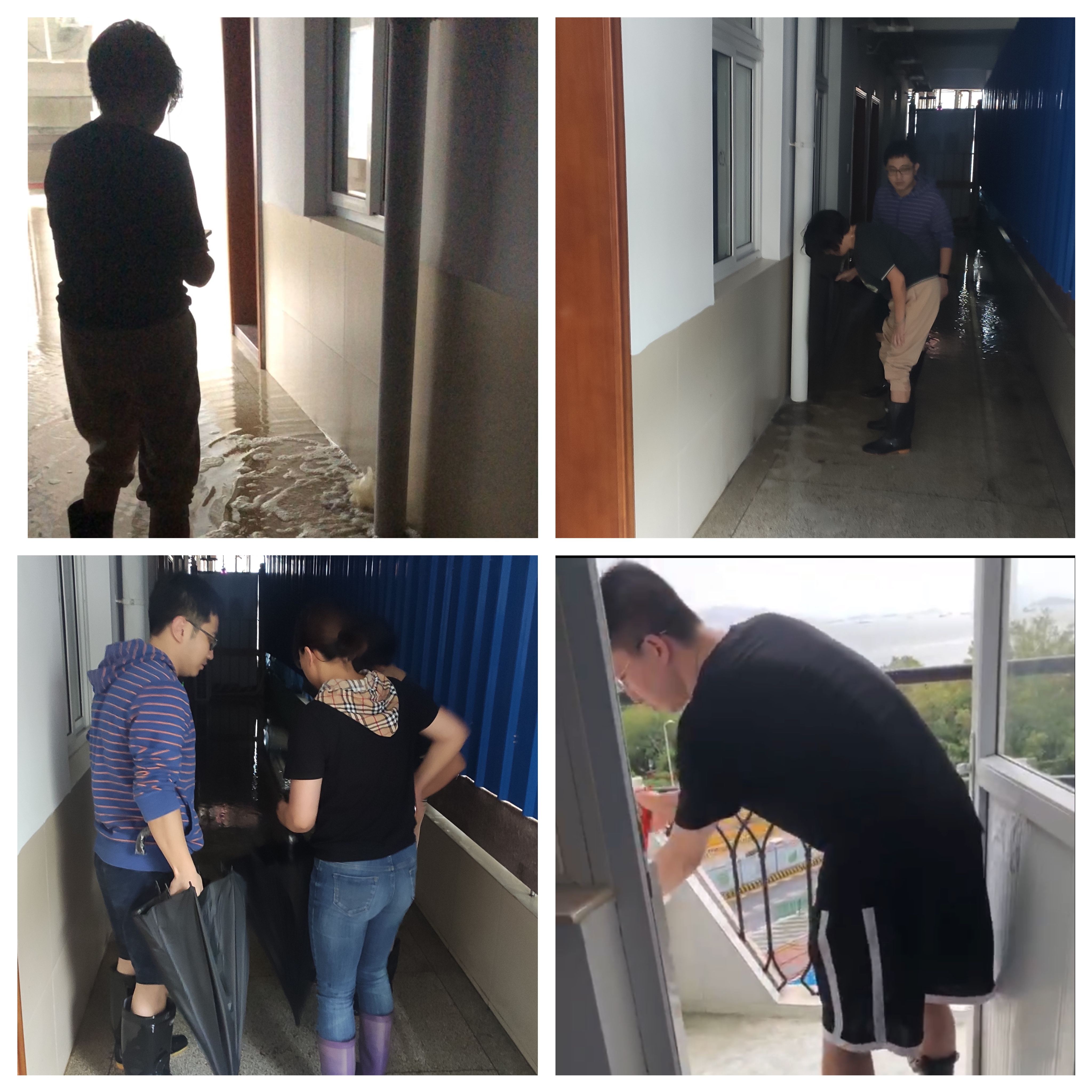 台风过后,院领导深入一线、靠前指挥,组织“守廌行动”小组迅速投入巡视检查和清理恢复工作。辅导员第一时间看望慰问在校学生,摸排学生人身安全及宿舍损坏情况,帮助有需要的学生及时解决困难。在院值守人员,第一时间巡查院楼情况,对台风造成的管道破裂、楼道积水等安全隐患问题及时进行处理,有条不紊地推进各项恢复措施。