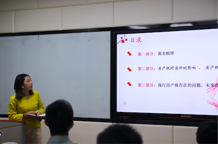 第三位主讲的潘灵蕴同学对目前房产税的现行问题进行了研究,并在此基础上提出了未来的改革建议。潘灵蕴首先指出了在其他同期税种已经多次修改的同时,现行的房产法几乎没有进行过大规模改动,并对沪渝两地的试点的合法性提出了质疑,认为其存在无相关文件授权和不符合税收法定主义的可能。此后又归纳总结了房产税征收范围过窄、计税依据不合理、税率过于僵硬且改革后税率偏低、配套措施不完善共五项问题。同时针对上述问题,她也相应地给出了优化税率结构、对计税依据进行改革、扩大征收范围、制定税收优惠政策和完善配套制度的建议;并着重阐述了“租税费一体化”这一体制,即通过明文立法为地方税打造主体税种,并在出现分歧时出台相关司法解释,防止其成为政策性工具;也要对土地出让金制度进行改革,减轻房屋所有人的收入负担以平衡其财产支出;与此同时,应该理清城市房地产开发建设中存在的诸多收费项目,清理相关收费,以明税、减租、清费三种手段来整合清理现有的房地产税收制度。