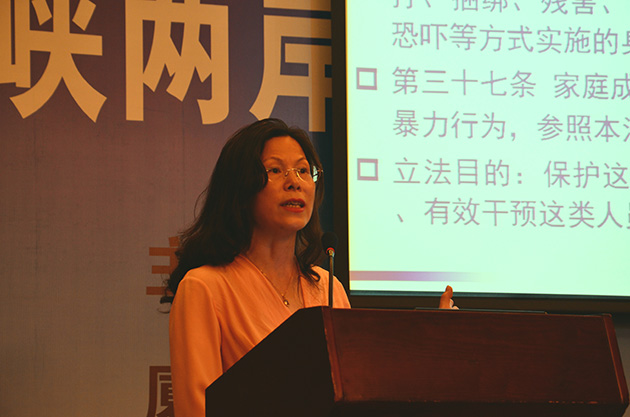 在第三议题,厦门大学法学院教授兼中国婚姻家庭法学研究会副会长蒋月第一个演讲,题目是《反家庭暴力法中“家庭成员以外共同生活的人”之认定》,跟大家分享她研究《反家庭暴力法》第37条的最新成果。廖家阳审判长报告《台湾家庭暴力防治法之发展和实务探讨》,侧重阐述了家庭暴力保护令制度与加害人治疗处遇计划。莆田市城厢区人民法院陈静庭长总结分析了司法实践中人身保护令的成效与难点。显然,反家庭暴力是任重道远。中国社会科学院法学研究所研究员、中国婚姻家庭法学研究会副会长薜宁兰主持该单元。