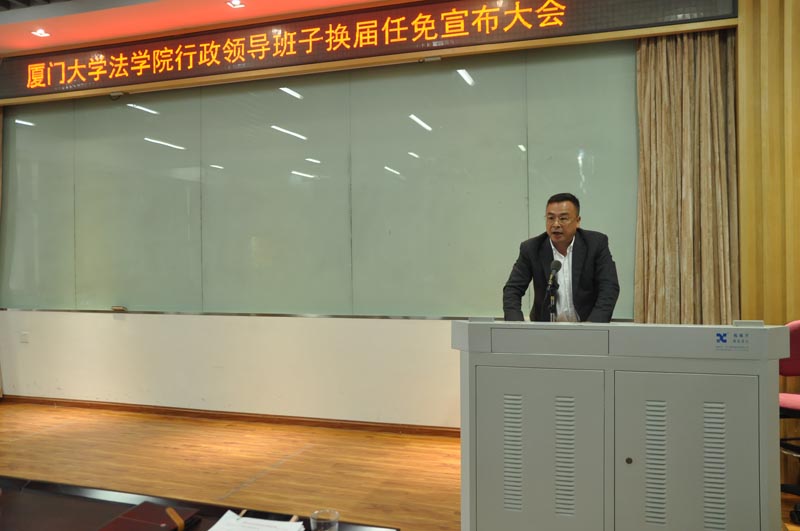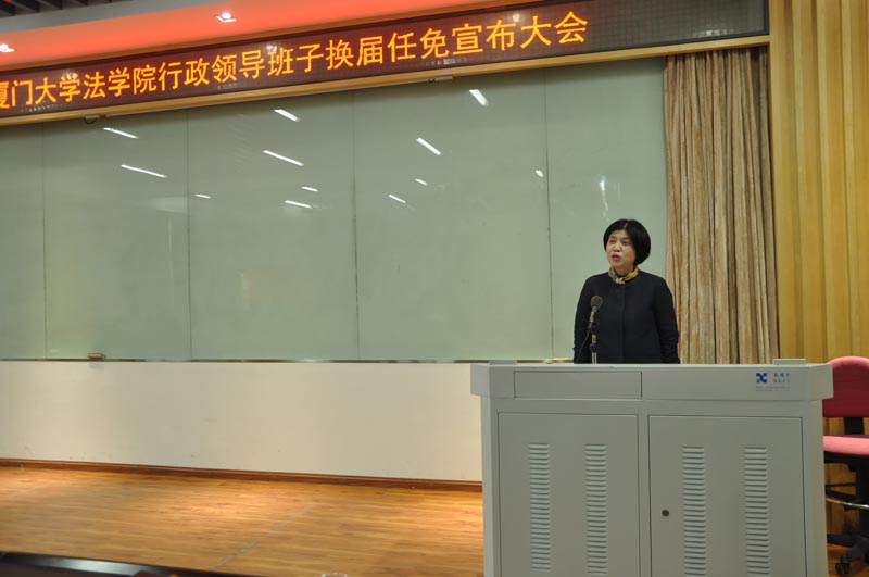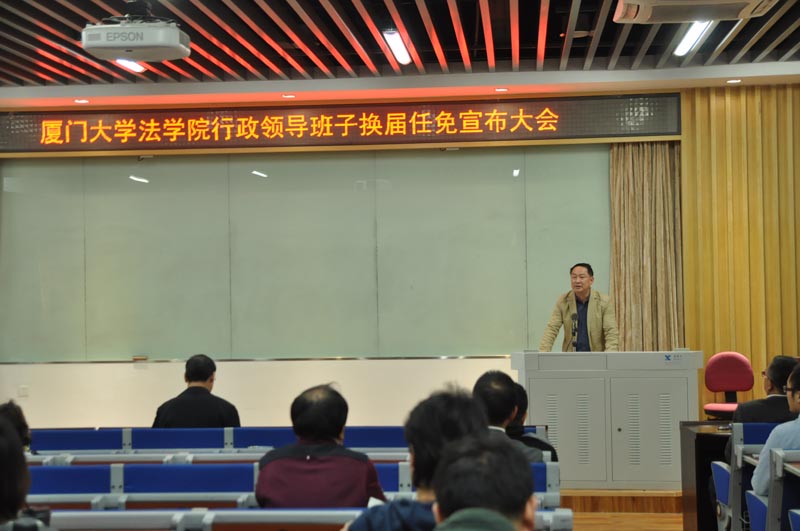 李建发副书记首先宣布关于法学院干部的任免决定并讲话:2017年11月10日,校党委常委会研究决定,宋方青任厦门大学法学院院长,何丽新、李国安、朱晓勤、郭春镇任厦门大学法学院副院长,林秀芹、朱炎生、李兰英不再担任厦门大学法学院副院长职务;2017年11月10日,校党委常委会研究决定,宋方青同志任中共厦门大学法学院委员会副书记,李国安、朱晓勤、郭春镇同志任中共厦门大学法学院委员会委员。
