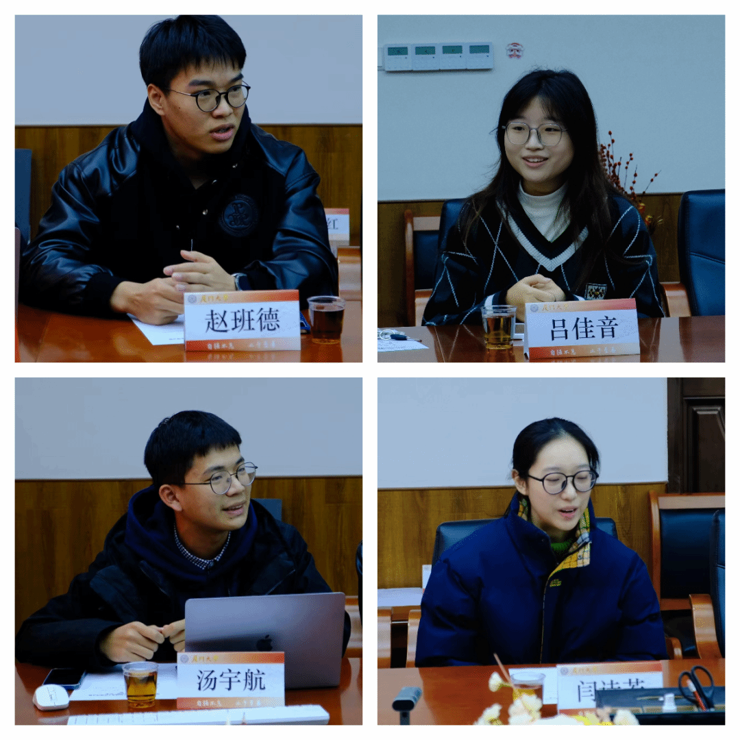 在座谈交流中,2021级本科生汤宇航、闫诗若、赵班德、吕佳音结合自己求职、考研备考、准备出国出境升学等经验,交流了自己对职业生涯规划、面试经验等方面的看法,建议可以进一步加强生涯教育引导,举办更有针对性的就业经验分享会,分享历年考研资料等。