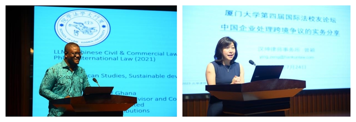 接着,国际贸易公司法律顾问、厦门大学法学院2017级博士生Perry Ackon校友做题为《Exploring China’s Global impact as Lawyers and imploring effective balance for maximum impact》的报告,他结合个人的律师工作经历分析了当前中国在跨国贸易方面的国际影响力,并表示中国在此方面的影响力会进一步增强。最后,汉坤律师事务所顾问、厦门大学法学院2007级硕士生曾颖校友做题为《中国企业处理跨境争议的实务分享》的报告,分享了中国公司在处理国际仲裁和跨境诉讼过程中面临的普遍问题,并结合其丰富的实践经验和生动的案例,向大家介绍了在程序上和实体上的应对措施,以及中国律师在此过程中可以发挥的重要作用。