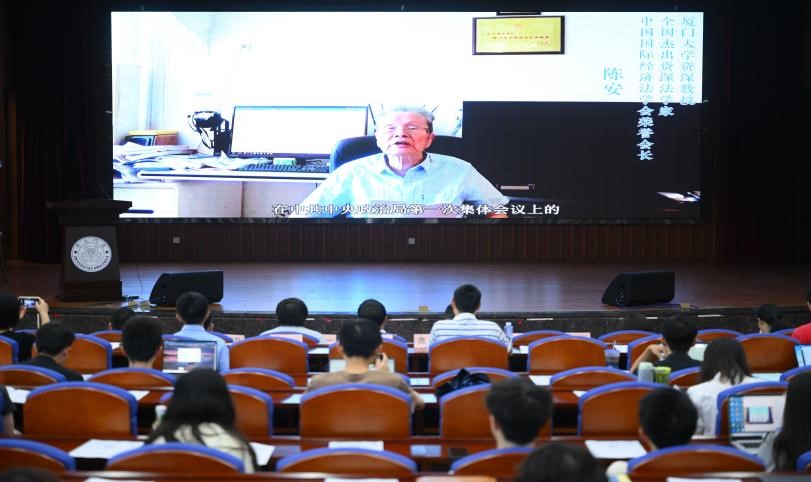 陈辉萍向远道而来的校友表示热烈欢迎。论坛伊始,为了祝贺本次论坛的举办,厦门大学资深教授、全国杰出资深法学家、中国国际经济法学会荣誉会长,94岁高龄的陈安教授特别录制了视频,以线上形式做了开幕致辞。陈安教授谈到,2016年9月27日,习近平总书记在中共中央政治局集体学习会议上强调:“要提高我国参与全球治理的能力,着力增强规则制定能力、议程设置能力、舆论宣传能力、统筹协调能力。参与全球治理需要一大批熟悉党和国家方针政策、了解我国国情、具有全球视野、熟练运用外语、通晓国际规则、精通国际谈判的专业人才。要加强全球治理人才队伍建设,突破人才瓶颈,做好人才储备,为我国参与全球治理提供有力人才支撑。”陈安教授将中国古代儒家以“礼、乐、射、御、书、数”为内容的“六艺”技能赋予新时代含义,提出“新六艺”的概念,勉励广大师生应共同努力,培养厦门大学品牌的法学一流人才。