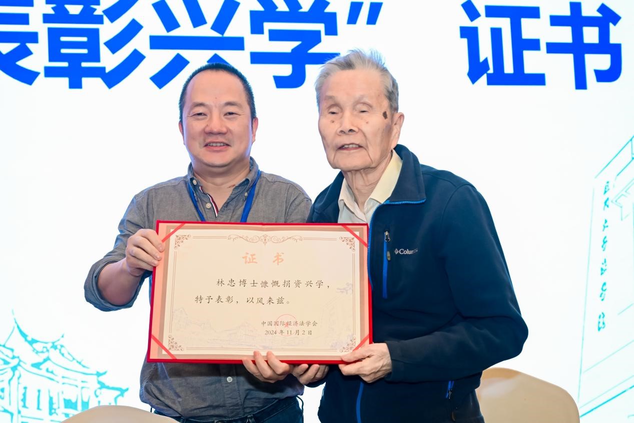 大会上午议程的最后环节中,曾华群会长向长期倾心倾力支持学会发展的社会各界人士的优秀代表颁发“表彰兴学”证书,感谢广东环宇京茂律师事务所主任何培华博士、北京市环球律师事务所上海分所合伙人赵德铭博士、上海瓴德律师事务所合伙人林忠博士、北京市环球律师事务所合伙人张昕博士、上海方通律师事务所律师傅明博士和前海股交投资控股(深圳)有限公司联席总裁蔡奕博士等为学会提供的慷慨支持。陈安教授回忆了学会从无到有、从小到大的艰辛,赞许并感谢基于促进学术繁荣目的支持学会和厦门大学国际法学科建设的社会各界人士。林忠博士代表受表彰者发表感言,表示在律师界也将发扬学会“知识报国”理念,与学会保持并扩大合作。