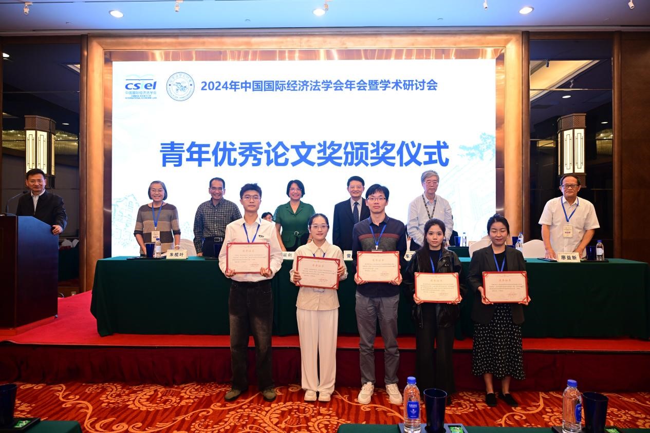 议程一是为2024年中国国际经济法学会“青年优秀论文奖”获奖者颁发获奖证书。中国国际经济法学会副会长、华东政法大学朱榄叶教授宣读了“青年优秀论文奖”获奖名单,由学会会长、副会长为获奖者颁发获奖证书。本次评奖活动共收到参评论文110篇,经学会组织公正严格评审,共有19篇学术论文获奖。“青年优秀论文奖”评奖活动由“厦门大学陈安国际法学发展基金会”提供支持。