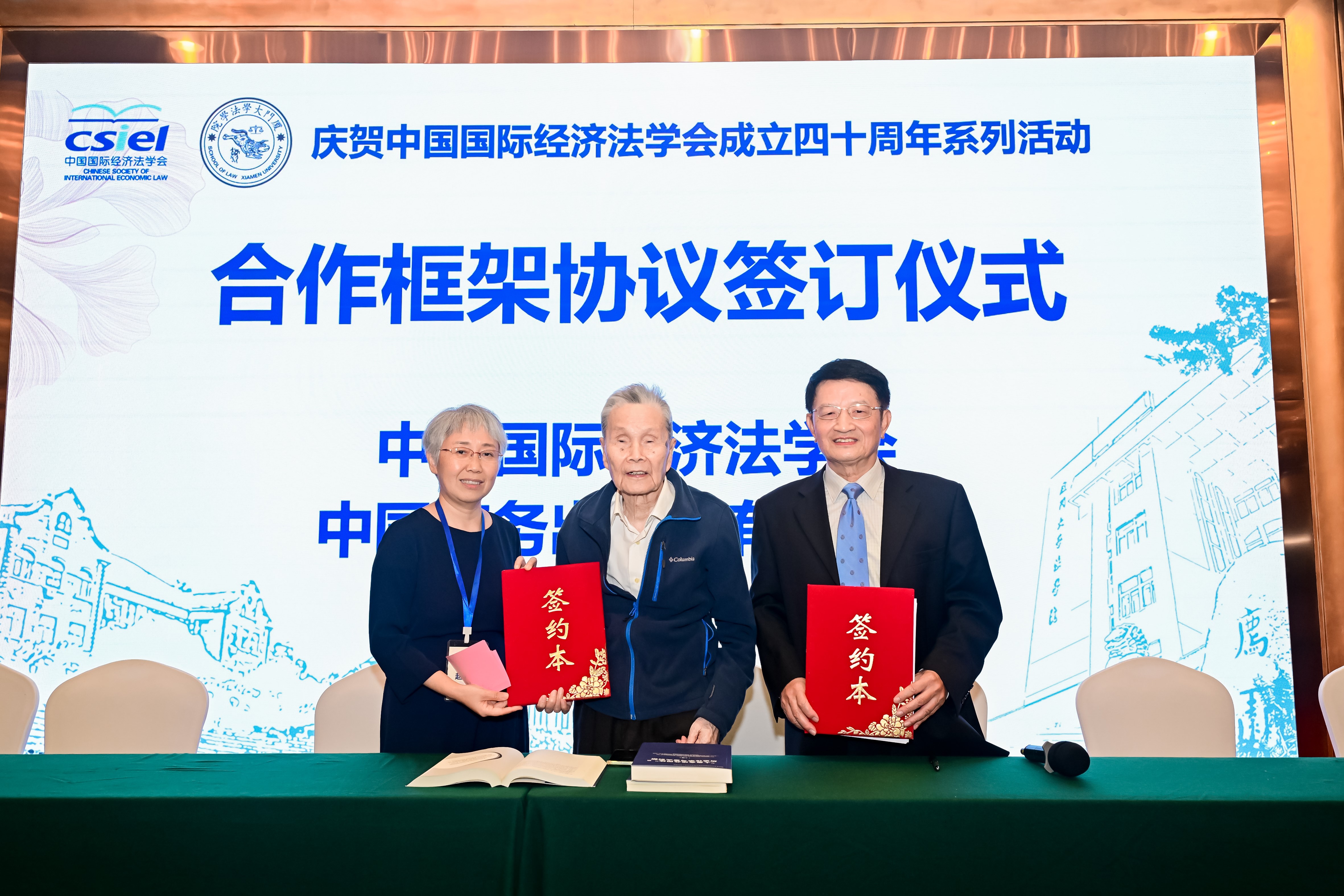 大会专题报告结束之后,中国国际经济法学会举行了庆贺学会成立四十周年的系列活动,由中国国际经济法学会副会长、中国政法大学王传丽教授主持,包括张月姣教授专题报告,“赓续传统,砥砺奋进——中国国际经济法学创建40周年”座谈会,陈安教授新书发布预告,《中国国际经济法学会与中国商务出版社有限公司合作框架协议》签订仪式,颁发中国国际经济法学会“表彰兴学”证书等环节。