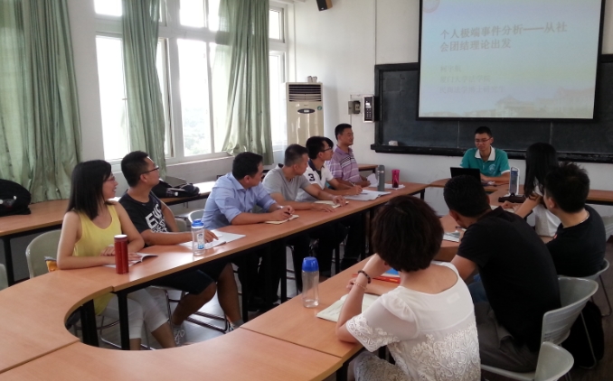 沙龙第一期由我院2014级民商法博士研究生柯宇航同学主讲,来自法学理论、法律史、宪法学与行政法学、民商法学、刑法学、诉讼法学、经济法学等专业的同学参与。柯宇航同学做了题为《个人极端事件分析——从社会团结理论出发》的专题报告,该报告以三段论的逻辑顺序一以贯之,柯宇航同学首先介绍了涂尔干的社会团结理论,主要包括机械团结与有机团结的区分,三种破坏有机团结的社会分工形式等等,其次通过对“个人极端事件”的概念分析与事实列举,进一步运用社会团结理论对其进行分析,找到“个人极端事件”发生的根源在于道德与法律的缺位以及制度设计的不公平等方面,最终提出防范“个人极端事件”的相关对策。