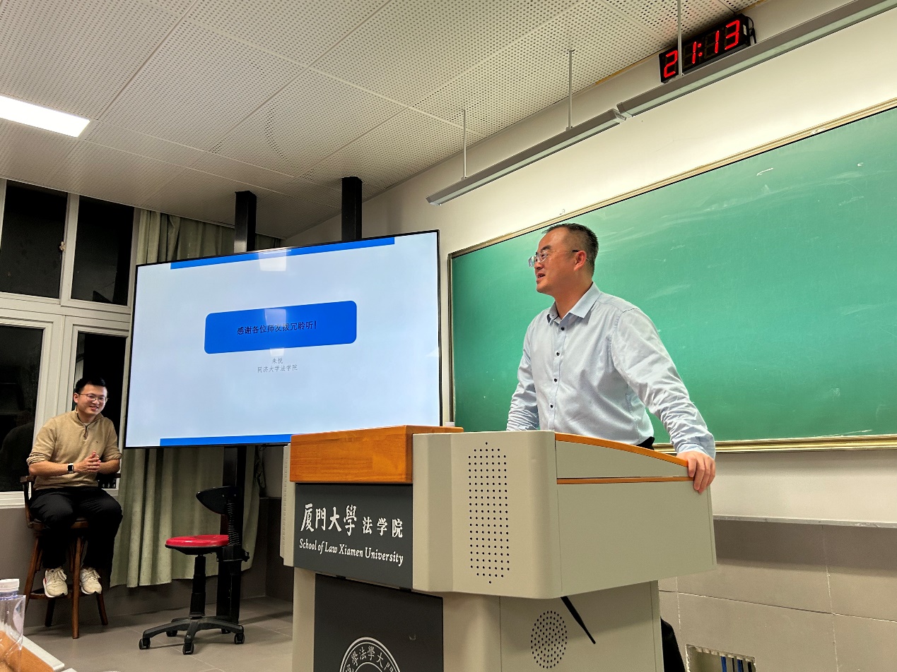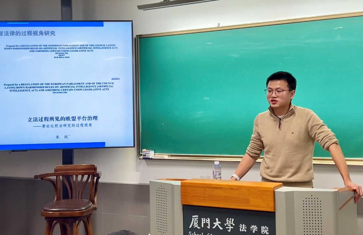 2024年12月5日晚,厦门大学法学院第七十七期信实“青椒会”学术论坛之“欧盟的六部‘人工智能法’:回顾、总结与前瞻”在法学院A201教室顺利举行。本期讲座由同济大学法学院助理教授、上海市人工智能社会治理协同创新中心研究员朱悦老师担任主讲人,厦门大学法学院吴旭阳老师、杨帆老师、王云清老师担任与谈人。厦门理工学院文化产业与旅游学院赖钰匀老师、厦门大学生命科学学院吕建伟老师、厦门大学知识产权研究院董慧娟老师,以及厦门大学法学院阳建勋教授、韩龙河老师、孙笑涵老师、许瑞超老师、邢文升老师等校内外嘉宾和几十位学生莅临讲座。厦门大学法学院法与政治经济学研究中心主任毛海栋老师主持本期讲座。
