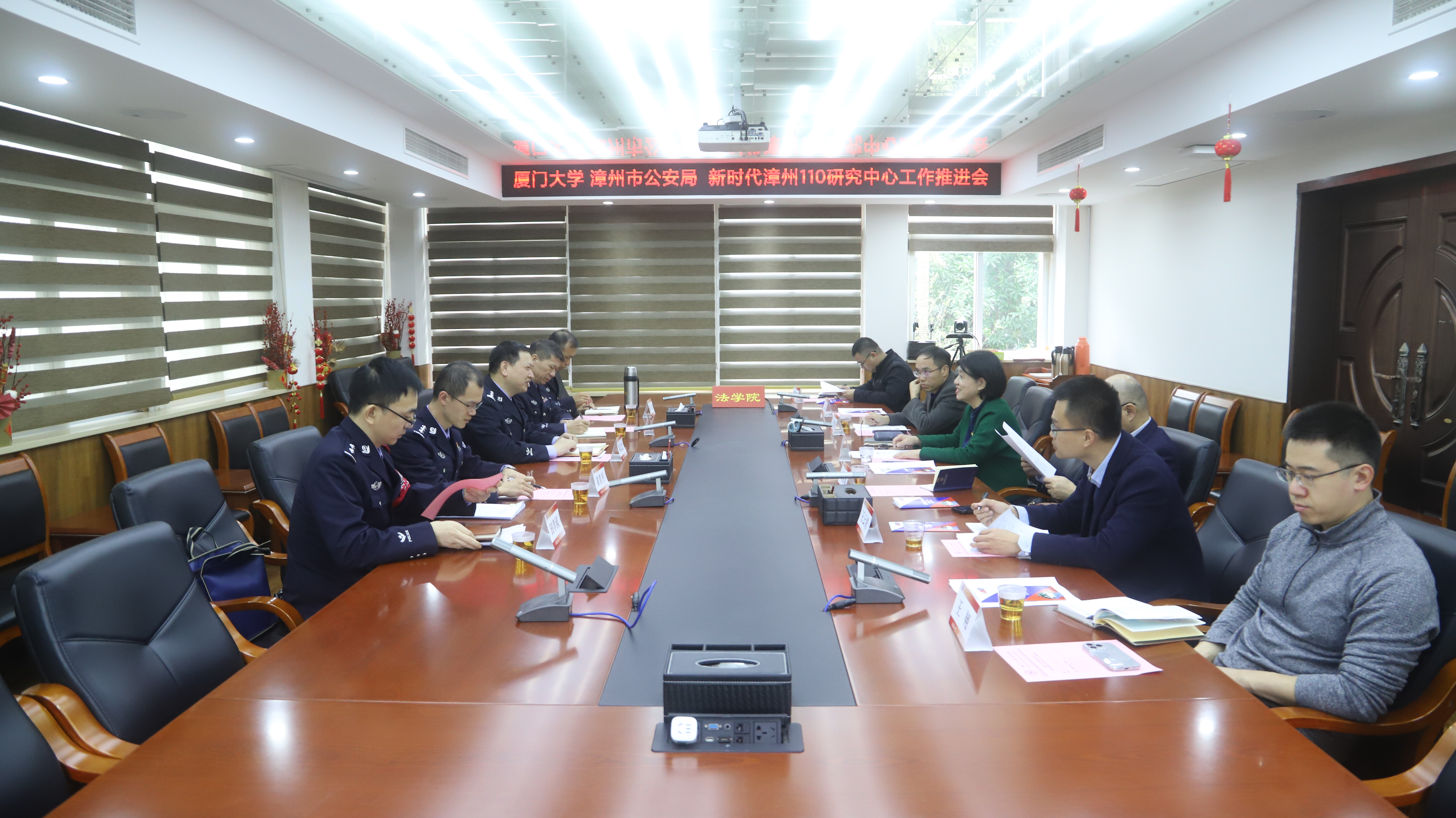 1月17日上午,厦门大学新时代漳州110研究中心(下称“研究中心”)工作推进会在法学院B220会议室召开。厦门大学法学院院长、研究中心主任宋方青教授,漳州市公安局巡特支队长、研究中心副主任韩志忠,副主任郭佳添,以及部分双方研究中心成员参加会议。