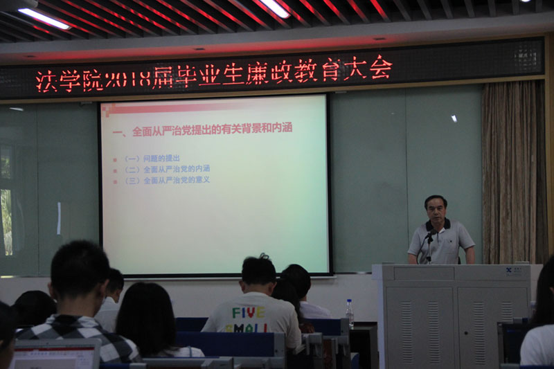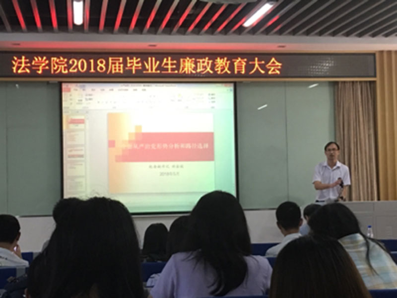 为提升毕业生的思想觉悟和廉洁意识,树立正确的世界观、人生观和价值观。法学院于2018年5月15日举行2018届毕业生廉政教育大会,并邀请厦门大学纪委副书记林金枝老师做了廉政教育的专题报告。
