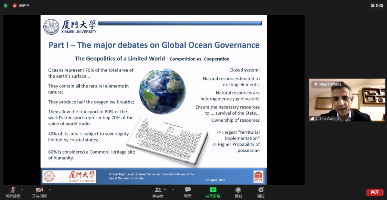 第七期讲座由联合国大陆架界限委员会葡萄牙籍委员、葡萄牙国际关系研究所研究员阿尔迪诺•坎普斯(Aldino Campos)教授主讲,题为“展望全球海洋的未来——全球治理面临的挑战”。坎普斯教授首先指出现阶段关于全球海洋治理的主要争论焦点,随后从地质学、法律上分别介绍了大陆架概念和相关公约的历史演进,他指出现阶段气候变化已成为全球海洋治理的挑战,并就如何应对这些挑战提出了自己的见解。