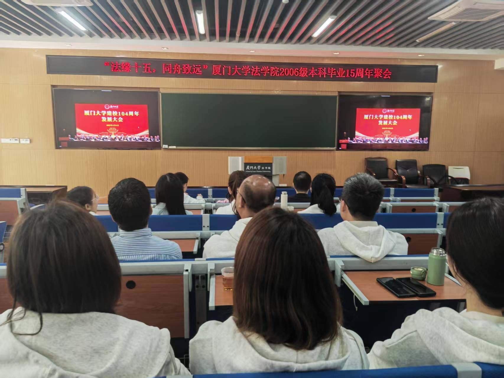 校友们落座于曾经一起激荡法学思想的教室,通过网络直播视频观看了“厦门大学建校104周年发展大会”实况,为母校“敢闯敢试,自强卓越”的发展新阶段欢呼鼓劲。