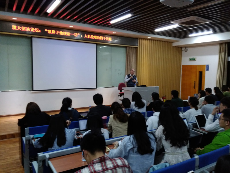 冯象教授讲授的内容生动有趣,从四个问题入手深入阐述了人工智能给人类带来的影响。首先,将来人工智能会带来怎样的改变。冯教授指出,随着人工智能的发展,失业会变成普遍现象,并带来社会福利扩大的刚需;其次,人工智能带来的威胁。一方面是机器人的自主和不自主界限不明,另一方面是军事化的挑战;再次,人工智能失控和法律对策。人工智能的发展使得整个社会各种服务终端化,一旦出了问题现有的法律框架很难处理。冯教授认为应建立一个全新的法律框架,重新分配责任,国家的监管也须有一整套体系;最后,人类自身的选择。冯教授将其归为共产主义,即机器人用爱来回应人机关系,而非意识形态本身的重复或回归。