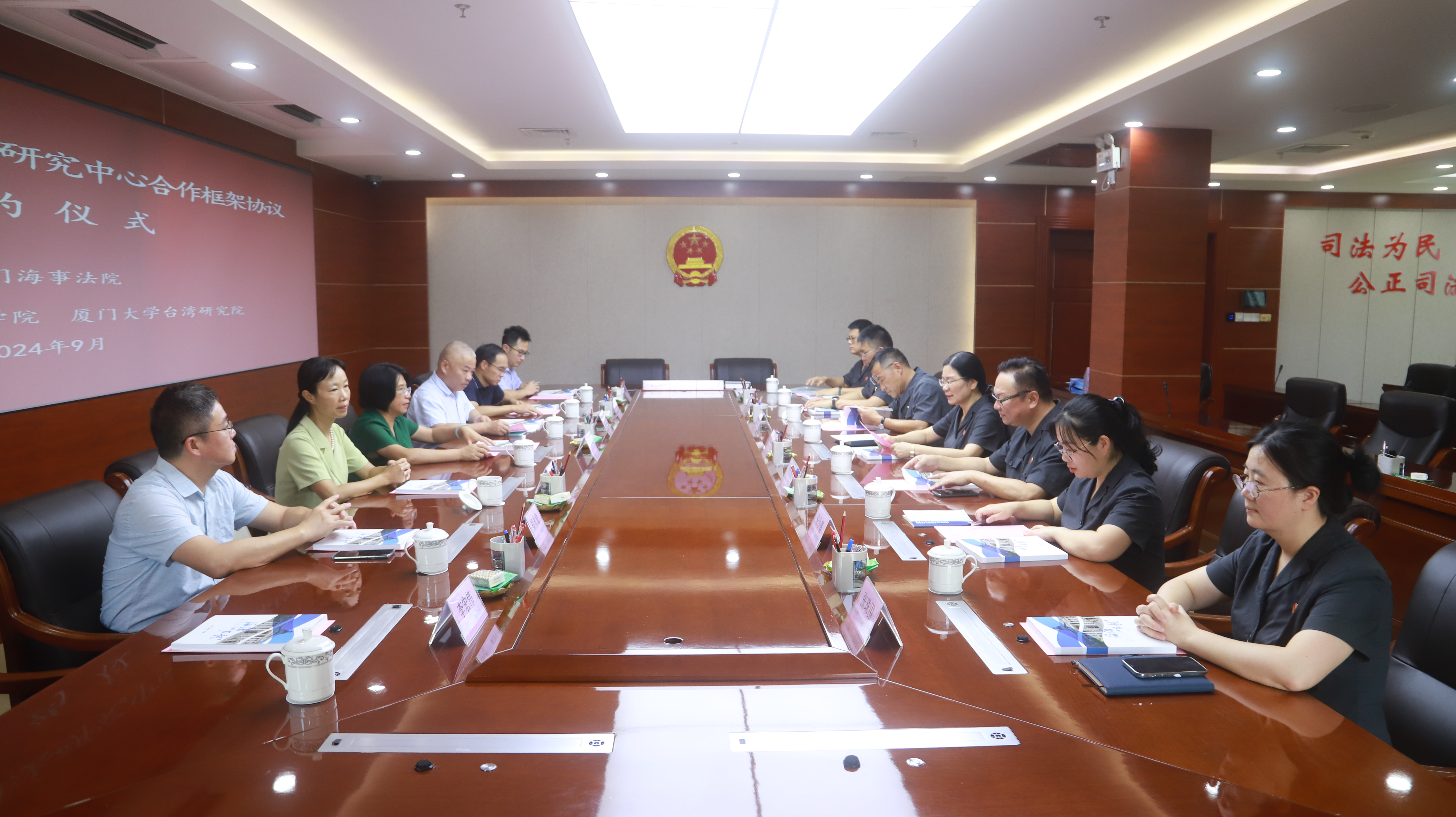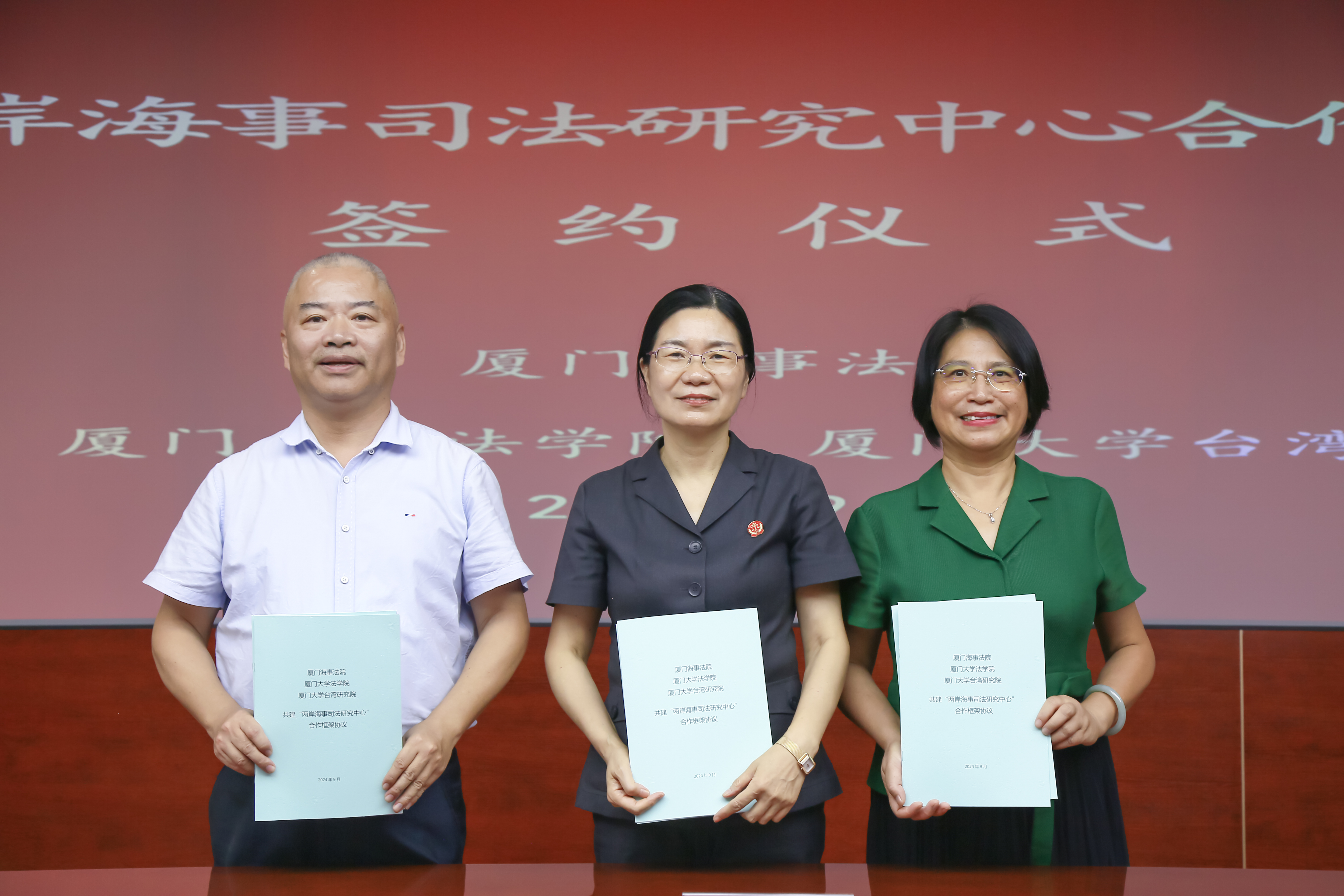 在《意见》授权发布一周年之际,为贯彻落实《意见》精神,厦门大学法学院、台湾研究院与厦门海事法院拟共建“两岸海事司法研究中心”。近日,“两岸海事司法研究中心”(下称“研究中心”)合作框架协议签约仪式在厦门海事法院举行。厦门海事法院党组成员、副院长温文华,党组成员、副院长李涛,法学院党委书记何丽新,副院长朱晓勤、王杏飞、郑永宽以及厦门大学台湾研究院党委副书记陈文等参加签约仪式。