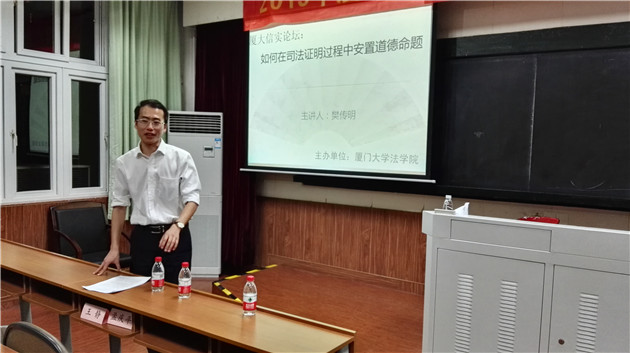 2015年11月25 日晚,厦大信实论坛第十期“如何在司法证明中安置道德命题”讲座在我院A302室顺利举办。讲座由中国政法大学法学博士,美国辛辛那提大学访问学者,华东师范大学法学院讲师樊传明老师主讲,法律史教研室吴旭阳老师主持,诉讼法教研室陆而启老师参加座谈,本专业博士、硕士生、在职研究生及部分本科生全程参与并聆听了讲座。