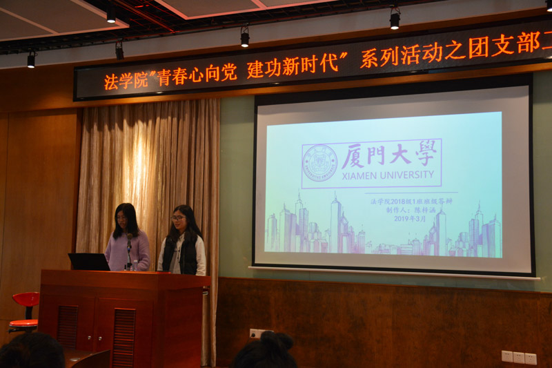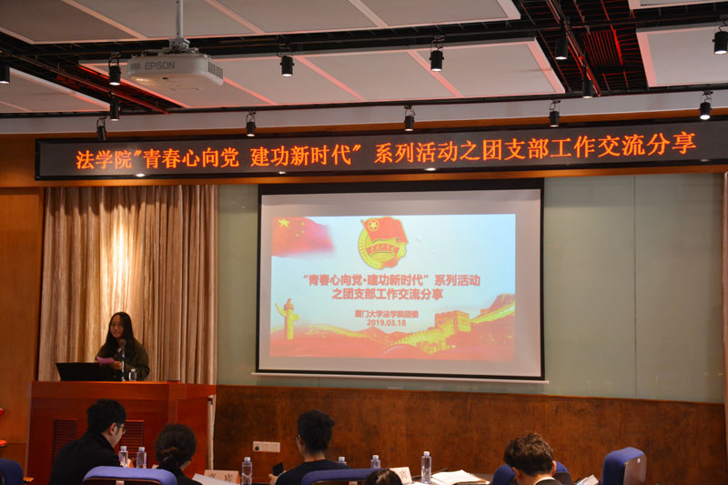 2019年3月18日14:00,厦门大学法学院“青春心向党·建功新时代”系列活动之团支部工作交流会在法学院B138报告厅召开。为推进党团建设、班级建设、学风建设,法学院2016-2018级共九个班级进行工作报告。法学院党委副书记张伟,团委副书记、研究生辅导员林旭荣,本科生辅导员高瑜聪出席本次会议,针对对各班工作进行提问并提出建议。