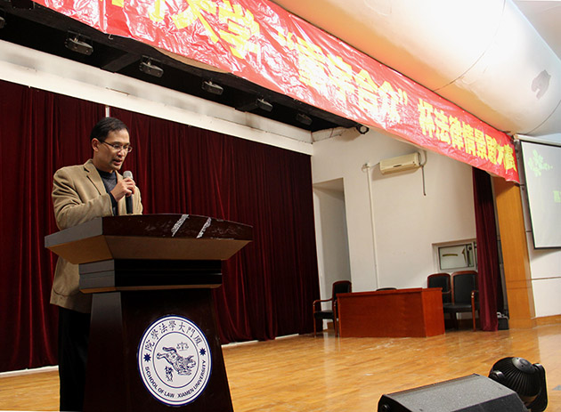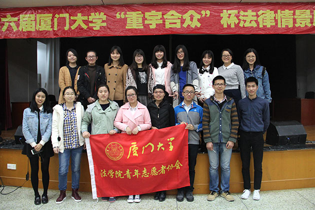 2016年3月28日19点30分,由厦门大学教务处、共青团厦门大学委员会、厦门大学法学院主办、厦门大学大学生法律援助中心暨法学院青协承办的第六届厦门大学“重宇合众”杯法律情景剧决赛在法学院模拟法庭正式上演。本次决赛邀请到了法学院党委副书记郭锦星、法学院吴旭莉老师、陆而启老师、汪东升老师、刘梦秘书等多位学院领导、老师以及重宇合众律师事务所首席合伙人、名誉主任涂崇禹律师和滨海司法所司法助理员刘洋担任评委。另外,还有多名来自重宇合众律所的律师和滨海司法所、厦港司法所的嘉宾受邀出席观看比赛。