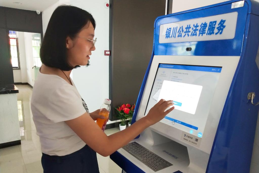 工作人员马璇向实践队队员们详细演示了正在进行试点的银川公共法律服务人工智能自助机,该智能机器人具有法律机器人问答、自动生成法律文书、远程律师视频解答等功能,未来设想该智能机器人将覆盖偏远乡镇,以解决偏远贫困群众的法律需求,并一定程度上缓解自治区各地经济社会发展差异较大、律师分布不均匀的现状及解决机构事多人少问题。