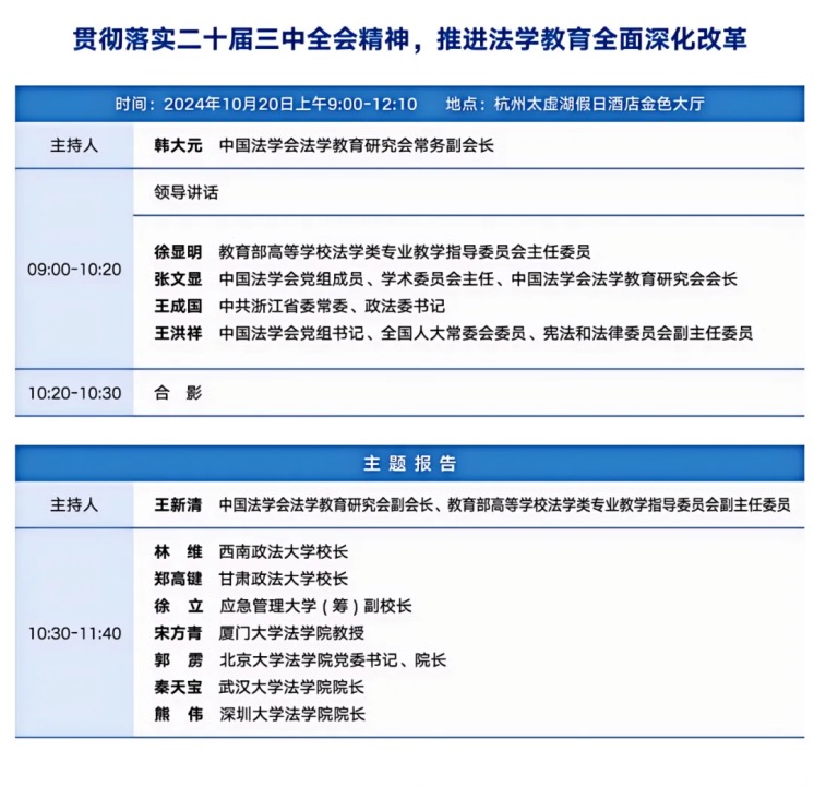 2024年10月18日-20日,教育部高等学校法学类专业教学指导委员会、中国法学会法学教育研究会2024年年会在杭州召开。大会以“全面深化改革,完善以实践为导向的法学院校教育培养机制”为主题,突出“以实践为导向”,聚焦创新高素质法治人才培养机制改革,为中国式法治现代化提供人才保障。来自国内各大法学院校近500余名专家学者汇聚一堂,共襄盛举。作为教育部高等学校法学类专业教学指导委员会委员、中国法学会法学教育研究会副会长,厦门大学法学院宋方青教授参加了本次年会并作大会主题发言。