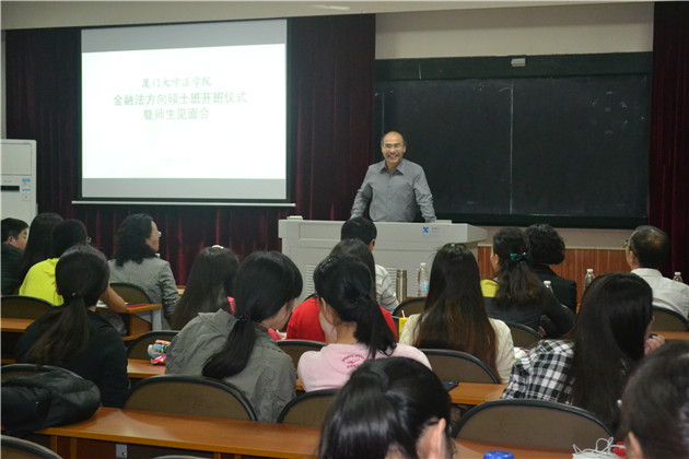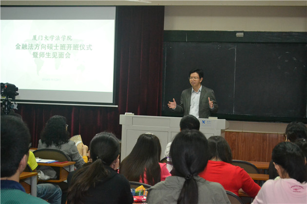 首先,作为金融法方向硕士班筹备组负责人,刘志云老师兴奋地表达了对这一全新集体成立的欣喜与感慨。刘老师强调,金融法方向硕士班是一个创新的集体,班级吸纳了经济法教研室校内外导师指导的经济法专业、环境法专业及法律硕士(金融法方向)的全部同学,不再有专业隔阂,也没有门户之见,校外导师更是云集国内相关金融监管机构、证券交易所、金融期货交易所、商业银行、证券公司、基金公司、上市公司、知名律所等金融、法律界一流精英。在导师分配方面,班级在传统导师与学生“一对一”的主导师制度基础上,创造性地提出导师组模式,金融法方向硕士班的同学将共享校内外导师资源,从而最大程度上凝聚和发挥集体的智慧与力量。谈及本次开班仪式,刘老师动情地说道,本次仪式是筹备阶段的结束,更是新历程的开始,以后的时光需要导师与同学们一道,在不停的尝试、摸索与磨合过程,一起努力与进步,让这个班级成为在厦大法学院,乃至全国著名院校法学院最有特色、最有成就的班级之一。
