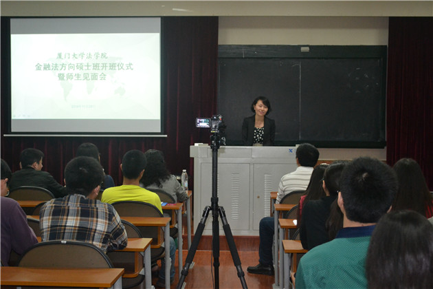 2014年11月29日晚七点,“厦门大学法学院金融法方向硕士班开班仪式暨师生见面会”在我院A302隆重举行,我院2012至2014级经济法专业、环境法专业研究生、法律硕士(金融法方向)同学悉数参加。经济法教研室林秀芹教授、刘志云教授、肖伟教授、郭懿美教授、游钰副教授、金海统副教授及周琛博士、毛海栋博士莅临本次活动,校外兼职导师代表福建省银监局吴育云老师、厦门证监局叶敏老师及厦门移山投资杨鹏慧老师也应邀出席。游钰副教授担任本次活动的主持人。