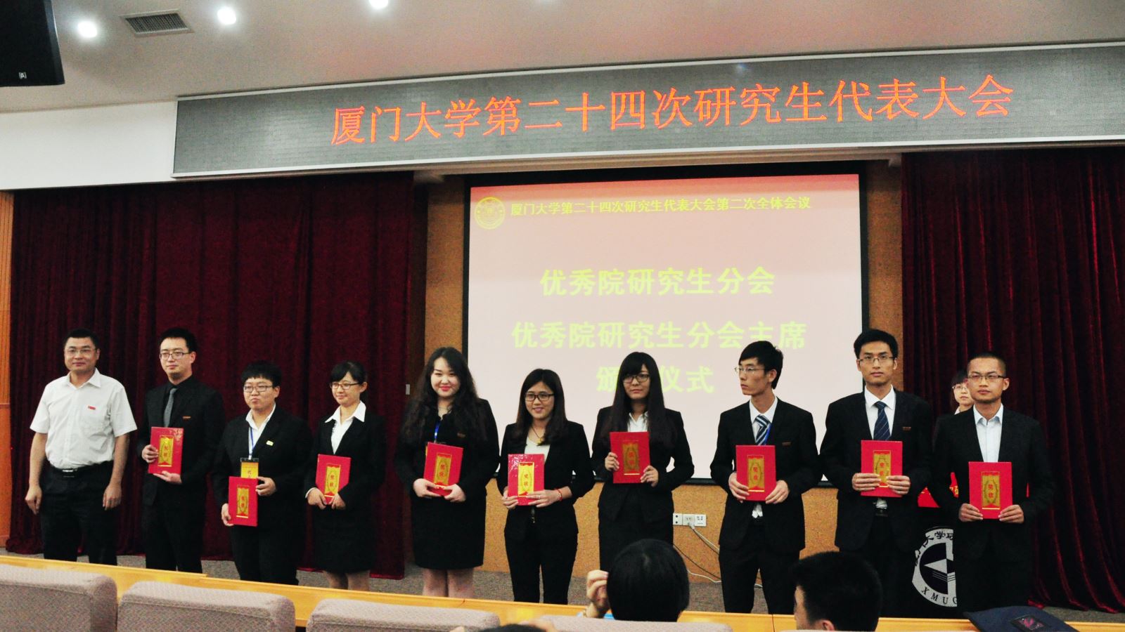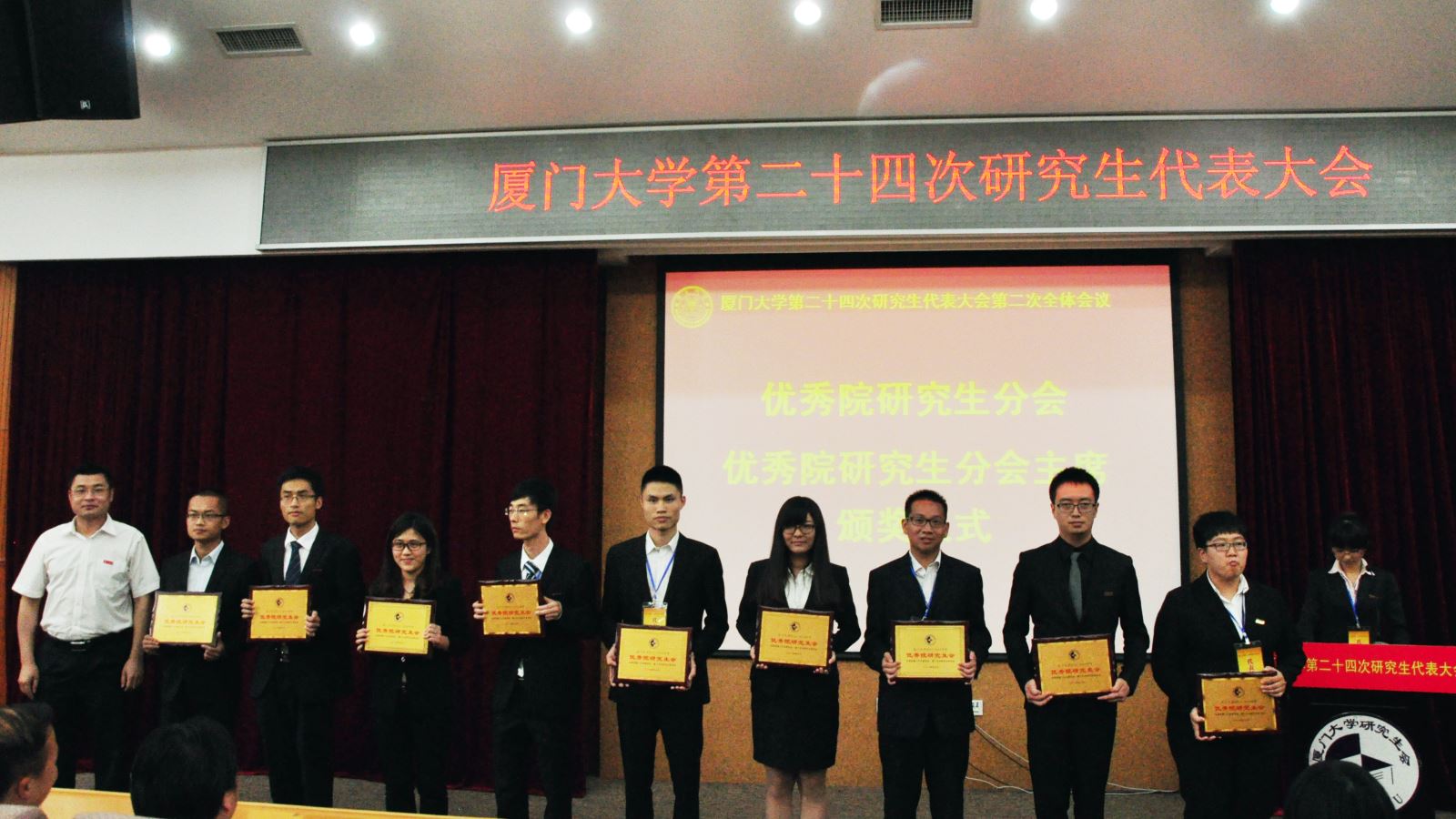 5月31日,在我校化学报告厅隆重举行了厦门大学第二十四次研究生代表大会,会上通过了校研究生会的各项议程,选举了第二十四届研究生委员会委员,并对5月18日评选出的年度“优秀院研究生会”及“优秀院研究生会主席”进行了颁奖。法学院研究生会凭借优异表现荣获“2013-2014优秀院研究生会”称号,研究生会主席杨盛澜获“2013-2014优秀院研究生会主席”称号。过去一年,我院研究生会不断加强制度创新,提高组织建设水平,锐意改革,促进研会规范管理,建立健全研会各项规章制度,在学院党委的领导和学院团委的指导下,围绕“学术为先”、“合理互助”、“服务成长”及“回馈社会”四个主题全面开展学生工作,充分展示了我院研究生团结奋进、积极向上的良好精神风貌,取得了有目共睹的成效,获得了如潮的好评。