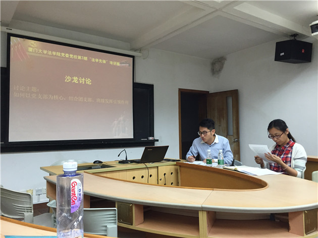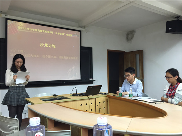 11月24日晚18:30,厦门大学法学院党委党校第三期“法学先锋”培训班系列活动之党支部书记沙龙在法学院C420成功举办。出席本次活动的领导老师有法学院团委副书记林旭荣老师,辅导员宋磊华老师,以及本科生和研究生各学生支部的支部书记。