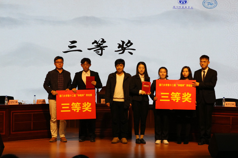 在随后的颁奖环节中,主持人宣布了获得此次辩论赛各项奖励的辩手和代表队,最佳辩手厦门大学周晓宇同学、三等奖厦门大学嘉庚学院代表队和华侨大学代表队、二等奖福州大学代表队、一等奖厦门大学代表队先后上台领奖。现场嘉宾和评委老师们也先后上台为获奖的辩手和最团体颁奖,并与各位辩手们合影留念。