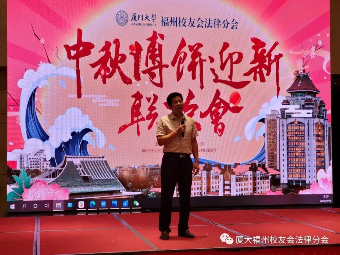 2020年9月26日,厦门大学福州校友会法律分会举办“中秋博饼迎新联欢会”,喜迎新校友,欢聚老校友,共庆中秋佳节。法学院党委书记许和山、副书记郭锦星、副院长朱晓勤等领导亲临会场送上祝福。厦大福州校友会学长叶文振,福州校友会副会长兼法律分会会长陈壮,各大政法学院福州校友会代表,在榕院友代表100余人共同参加了联欢会。