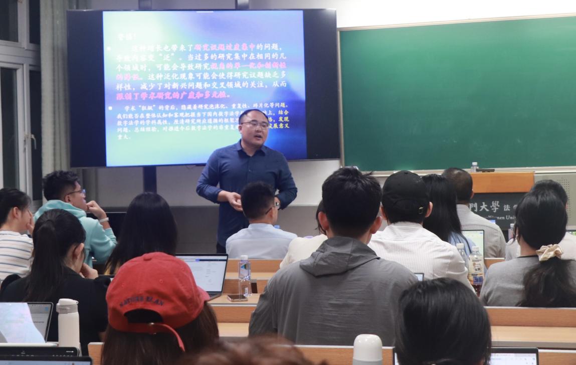 2024年11月12日晚,信实“青椒会”学术论坛第七十一期于厦门大学法学院A202教室顺利举办,本次论坛邀请到山东大学法学院副教授、智慧国家治理实验室研究员、信息科学与工程学院副院长、青岛市常委会地方立法研究基地副主任、青岛市法治政府研究中心常务理事宋保振老师来院开展题为“我国数字法学研究发展史”的专题讲座。讲座由我院法学理论教研室王云清副教授主持,吴旭阳副教授、毛海栋助理教授、许瑞超助理教授担任与谈人,法学院诸多师生到场聆听。