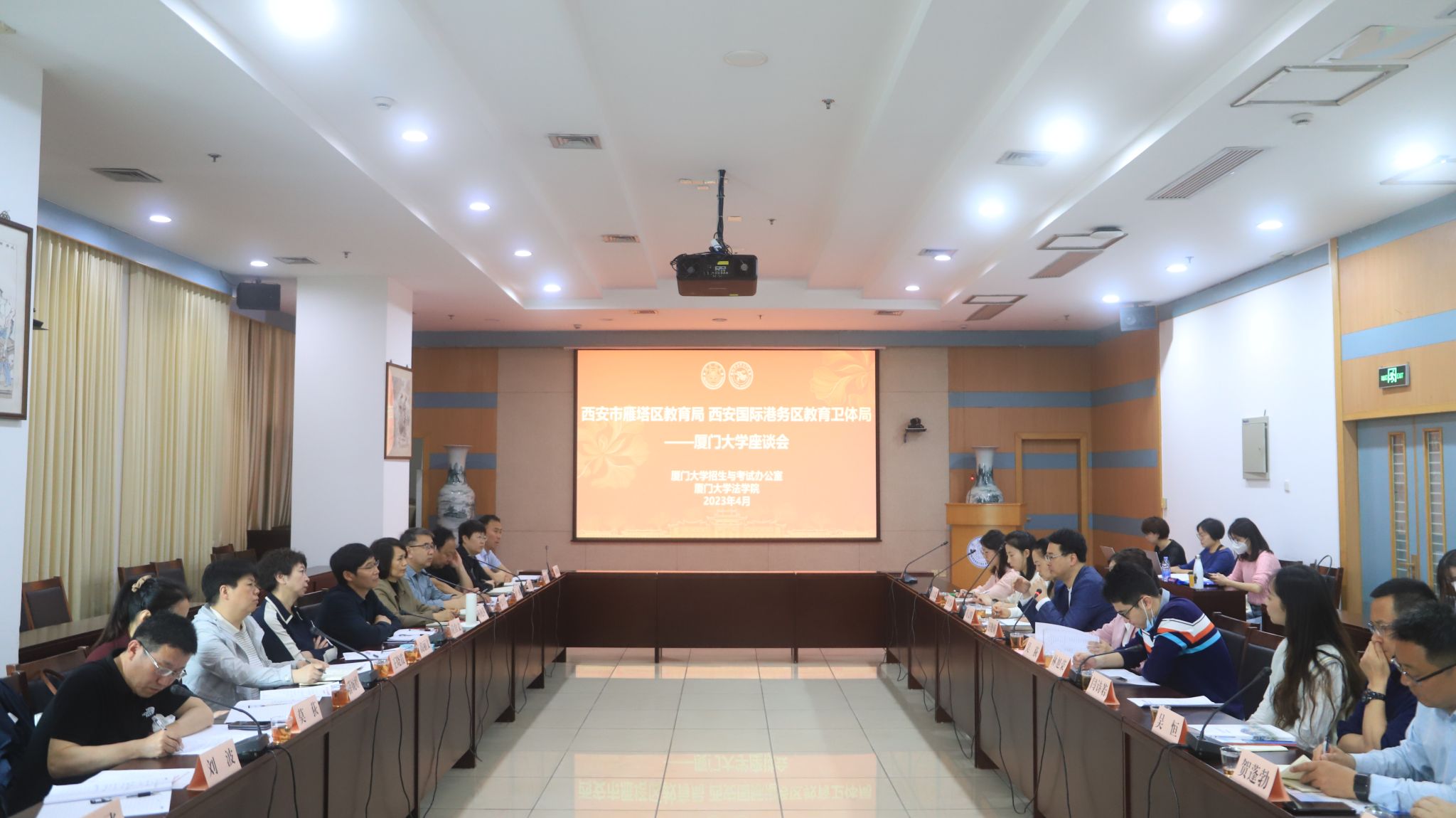 4月14日上午,厦门大学2023年西安市雁塔区教育局本科招生座谈会在颂恩楼220会议室召开。我校招生与考试办公室副主任王晓萌,陕西省招生宣传组副组长、法学院党委副书记吴荻,原陕西省招生宣传组副组长、社会与人类学院副院长冯文晖,法学院办公室主任林旭荣,法学院助理教授孙笑涵等,与西安市雁塔区教育局副局长左自文、西安市雁塔区各中学校长、副校长等30余位领导老师展开座谈。吴荻副书记担任此次座谈会的主持人。