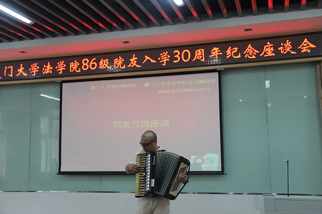 接着,86级院友齐彤拿起了手风琴,一场别开生面的大合唱就此开始。在手风琴悦耳的伴奏下,院友们齐声歌唱《年轻的朋友来相会》、《萍聚》、《少年壮志不言愁》等经典歌曲,气氛热烈,令人感动。