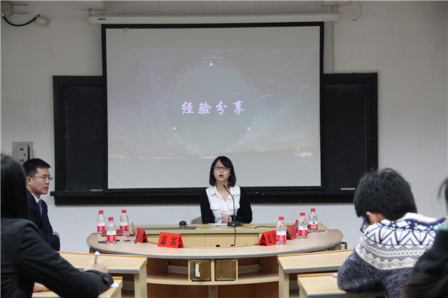 高斌老师作了讲座的致辞,对学长、学姐重返母校,与同学们分享成功经验表示感谢,同时也衷心期望各位同学从讲座中有所收获、有所启迪。在经验分享环节,孙国锋学长幽默诙谐地为同学们分享了他的创业和求职经历,告诉我们:不断挖掘自身潜能,端正求职态度,持之以恒,我们也能获得成功;在求职中,把握机会、争取机会、创造机会,千万不能坐等。紧接着,孙国锋学长站在银行招聘考官的角度为同学们的求职就业提出诚恳建议,他指出,在面试中求职者应该注重细节,应当将自己最突出的一面展示出来,用自己的热情感染考官。在知识积累方面,他强调在校时我们需要不断提升人文素养,掌握基本的财务金融知识。最后,孙国锋学长还为我们分享了他的工作准则。
